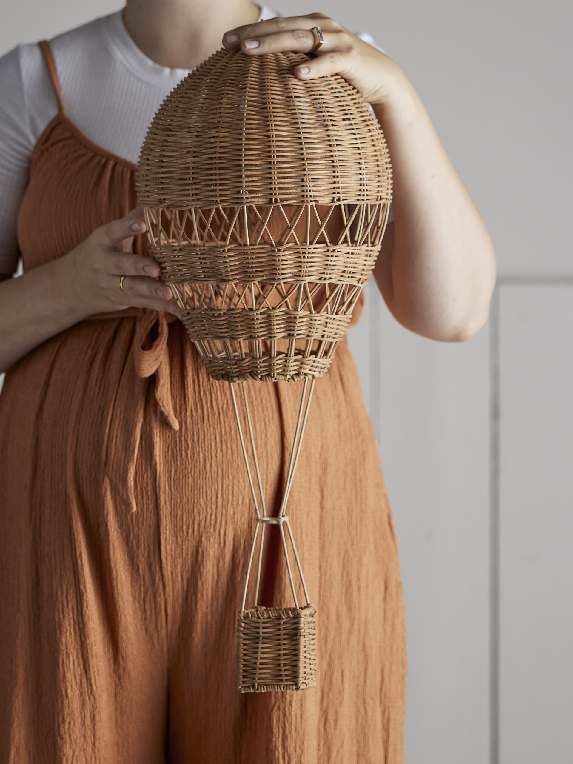 De decoratie is volledig gemaakt van rotan, een duurzaam en milieuvriendelijk materiaal. Rotan geeft de luchtballon een natuurlijke, warme uitstraling en een lichte textuur die een rustieke charme toevoegt aan de kamer.
