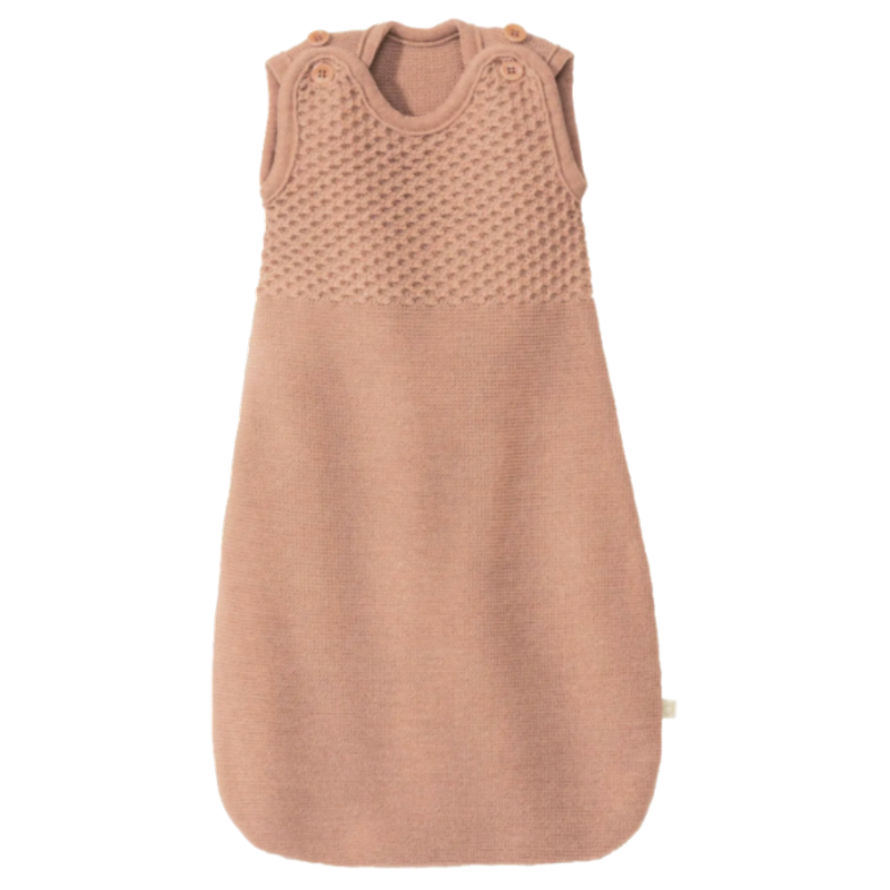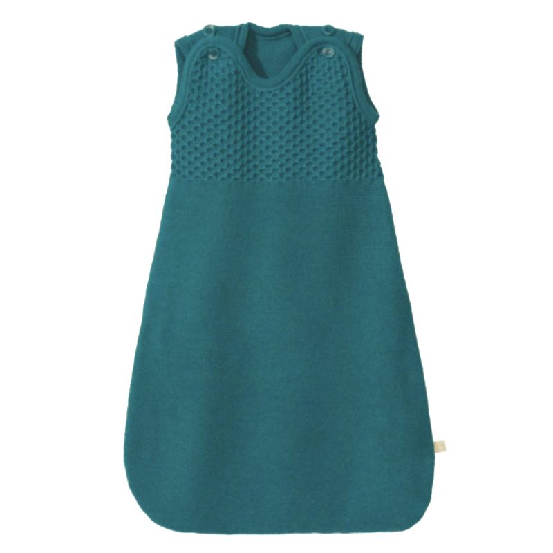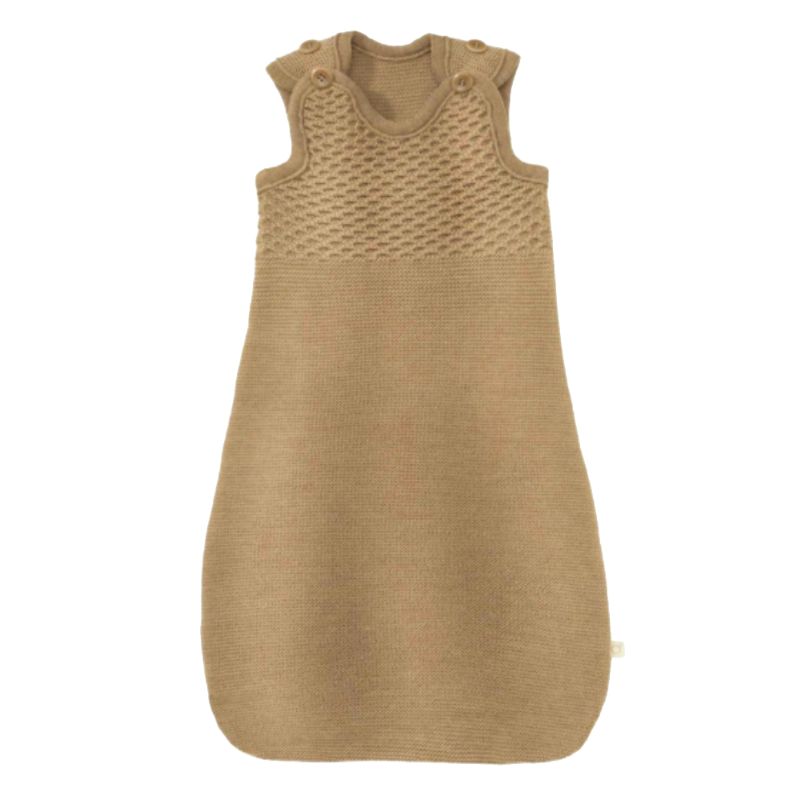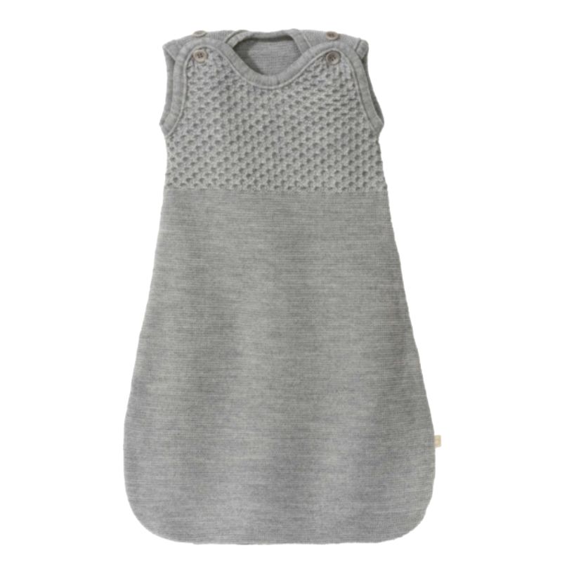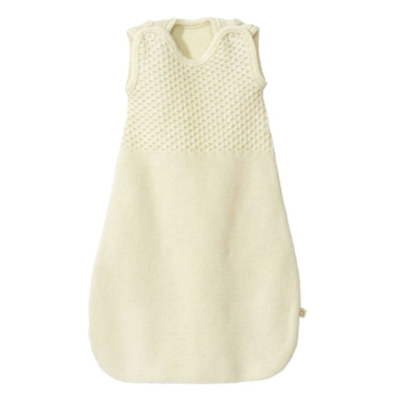 Het borst- en schoudergedeelte van de wollen slaapzak is gebreid in een fijn honingraatpatroon. Dit zorgt ervoor dat de slaapzak goed op zijn plaats blijft zitten en je baby comfortabel ondersteund wordt.