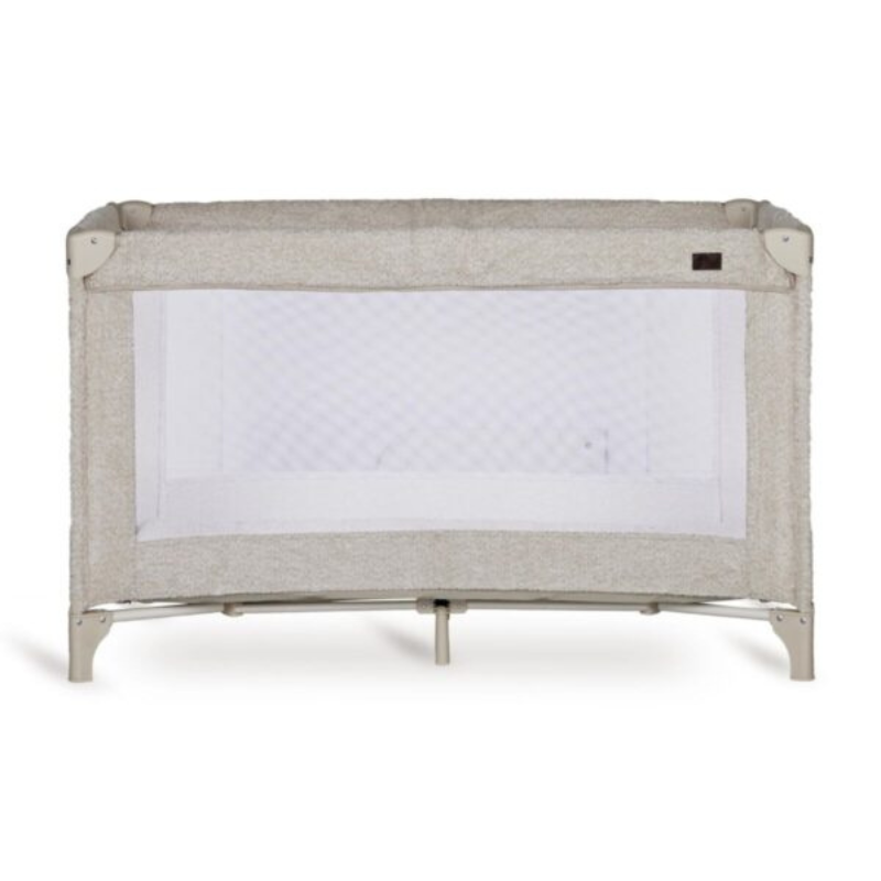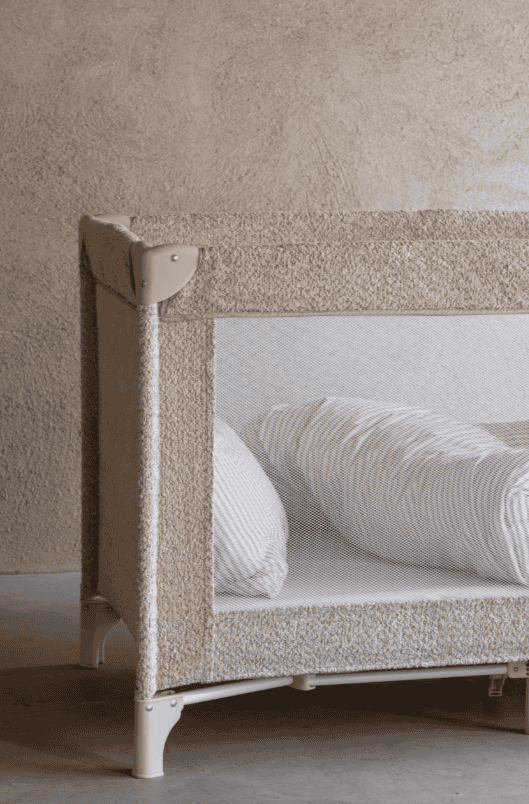 Het bedje is afgewerkt met zachte bouclé stof die niet alleen knus aanvoelt, maar ook een elegante uitstraling geeft. Zo slaapt je kleintje veilig én in stijl, waar je ook bent.